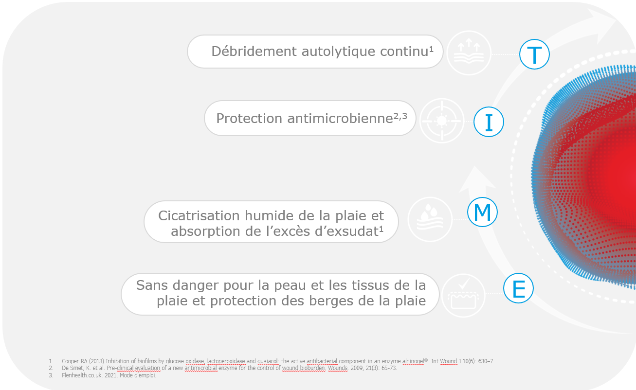 Contient un système enzymatique antimicrobien qui offre une protection en réduisant les bactéries des biofilms, souvent présents dans les plaies chroniques.